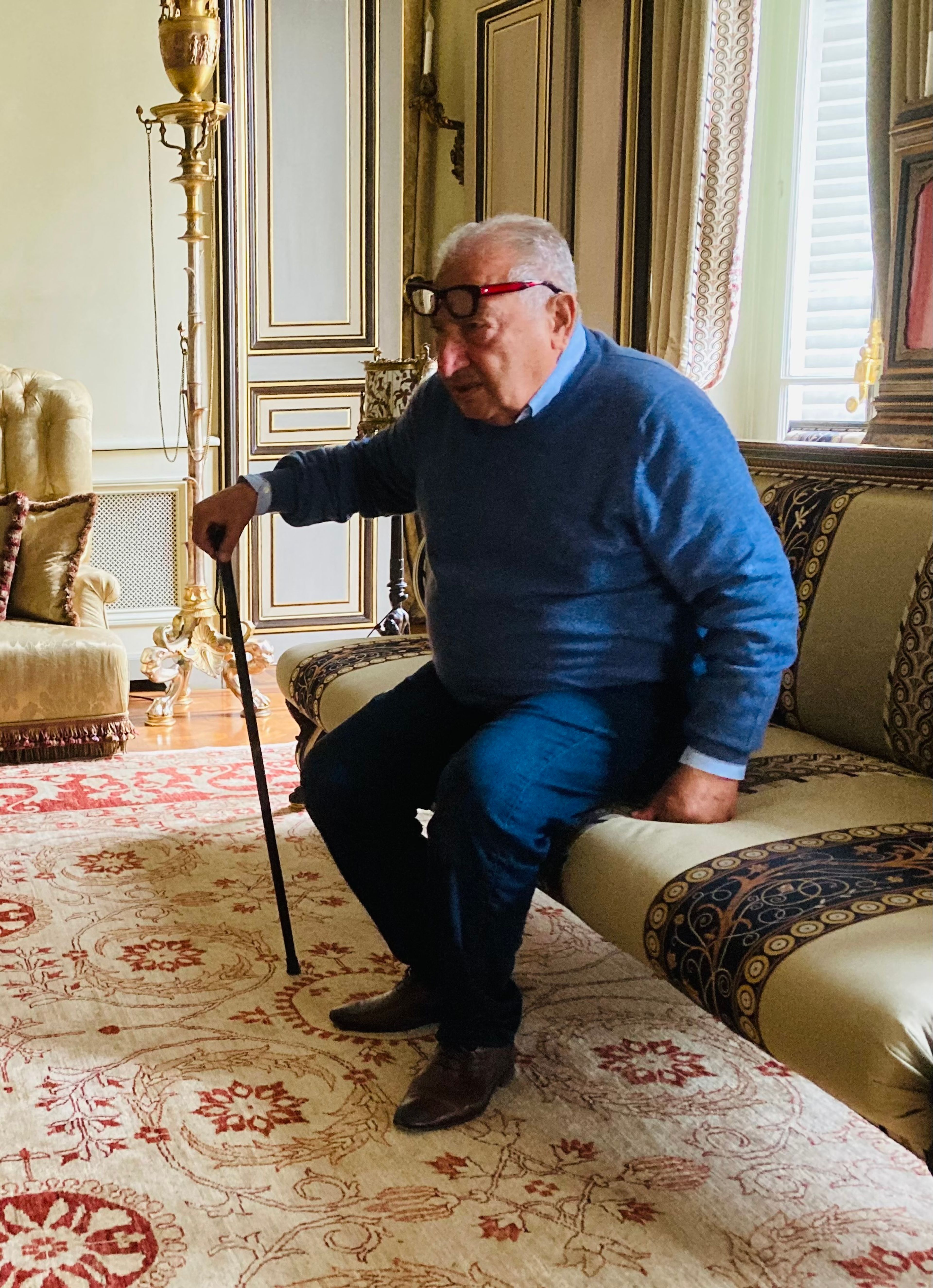 Dressed casually in dark jeans, brown leather oxfords, and a navy sweater over a crisp powder-blue shirt, the then-84-year old wryly appraised his guests from a throne-like seat in a yellow silk-lined Napoleon III armchair in his opulent living room. Around him, nineteenth-century gold-trimmed furniture, antique carpets, and a carved marble fireplace filled the lavish space.