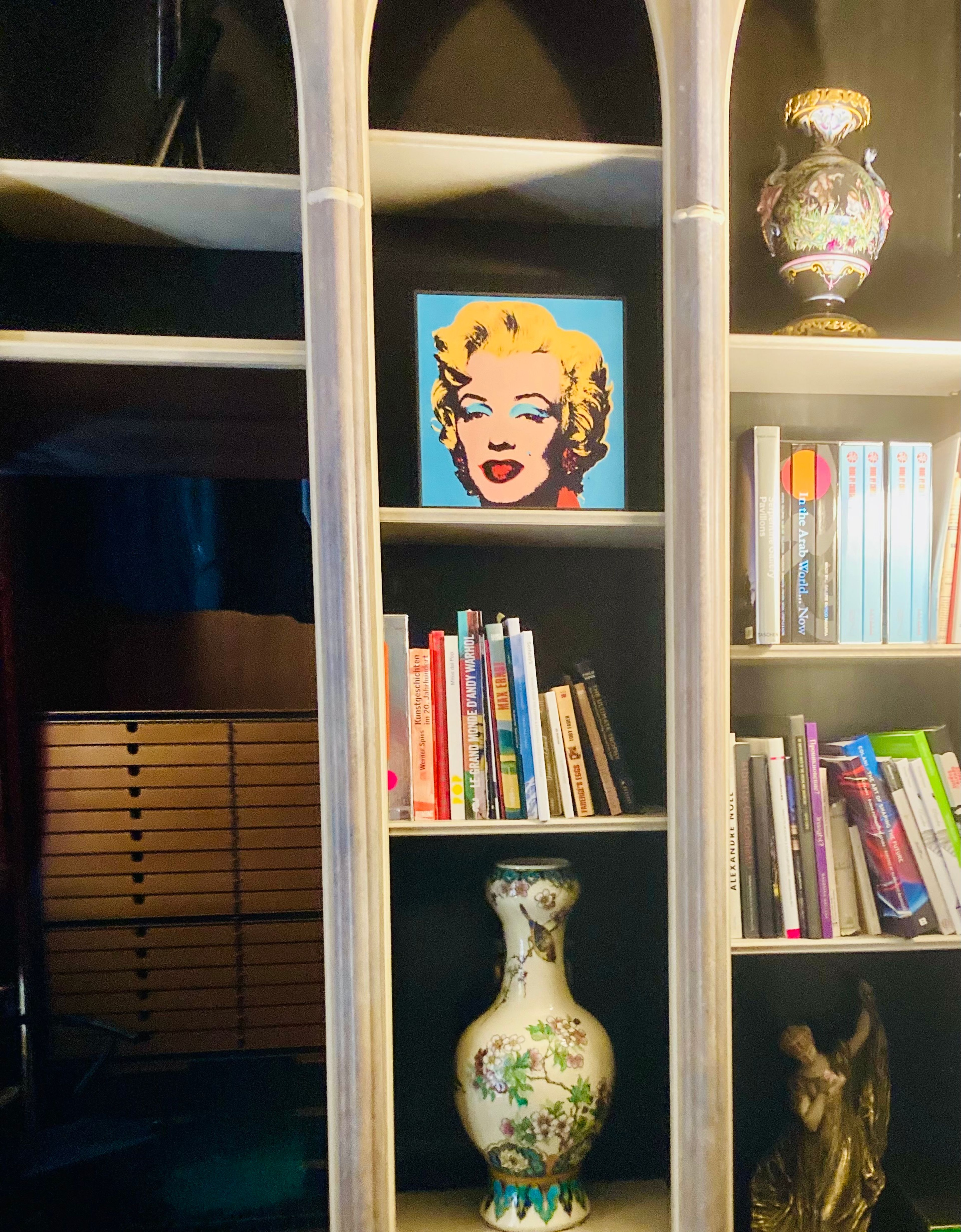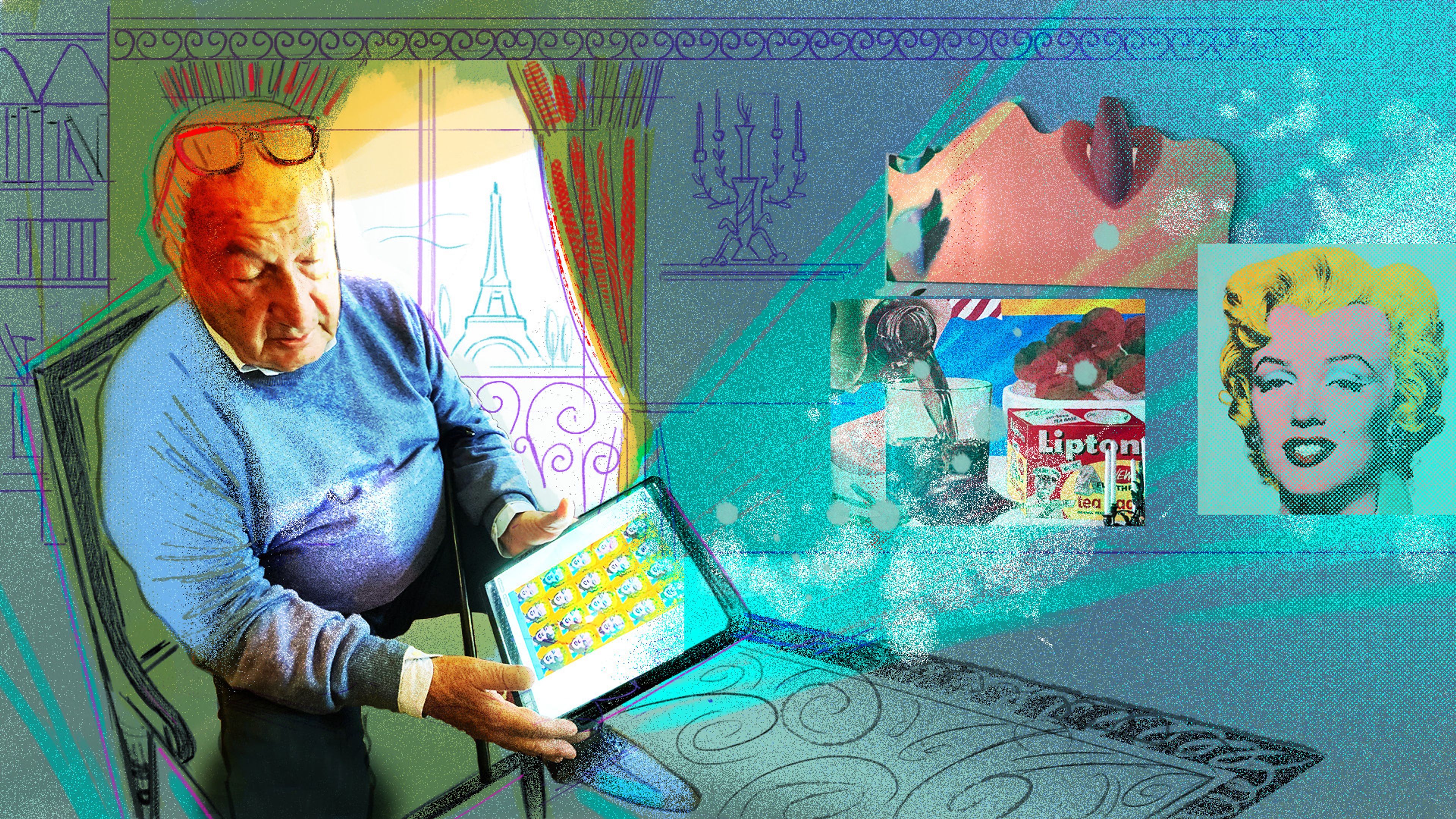 Back in his palatial Paris apartment, upon finishing the interview, Mugrabi takes reporters on a tour. The walls are eclectically curated—a Renaissance painting in the living room, a pop-art Lipton ice tea collage by artist Tom Wesselman in the dining room, near a stained glass window bearing Mugrabi’s signature, and a small Warhol painting of a smiling Marilyn Monroe on his bedroom shelf—a testament to a lifetime of collecting. Showing off these acquisitions, including some of his favorites of early Warhol illustrations for children’s books, he repeats a line he’s used before: “I bought a part of American culture.”